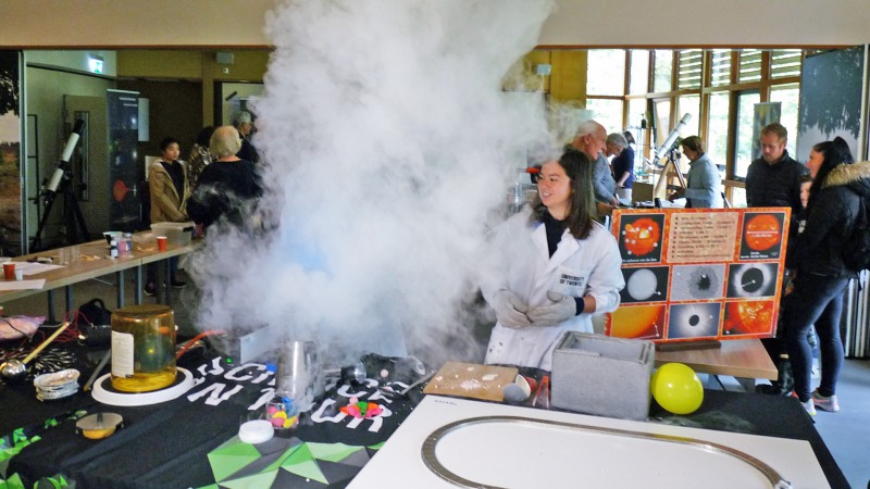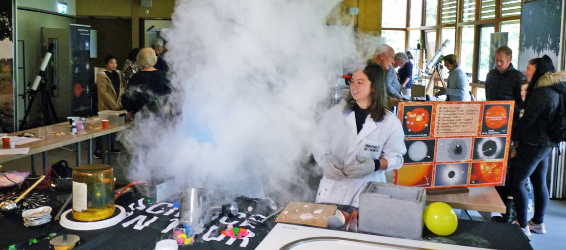 Science on Tour van de UT presenteert diverse stikstof proeven en zelfs kun je meemaken hoe een waterstofgenerator van water, waterstofgas gemaakt met energie van zonnepanelen. En alsof dat nog niet genoeg is, is er ook een Van der Graaf generator die je de haren te berge doet rijzen, een magnetische buis, een vliegende schijf en een vlammenorgel. Super spannend en spectaculair allemaal.